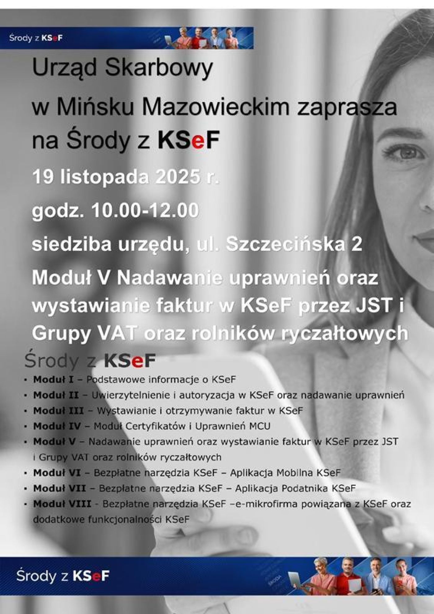 Najbliższe planowane spotkanie w formie stacjonarnej - Moduł V – Nadawanie uprawnień oraz wystawianie faktur w KSeF przez JST i Grupy VAT oraz rolników ryczałtowych odbędzie się 19 listopada 2025 r. w godz. 10.00 – 12.00 w siedzibie Urzędu Skarbowego w Mińsku Mazowieckim ul. Szczecińska 2.